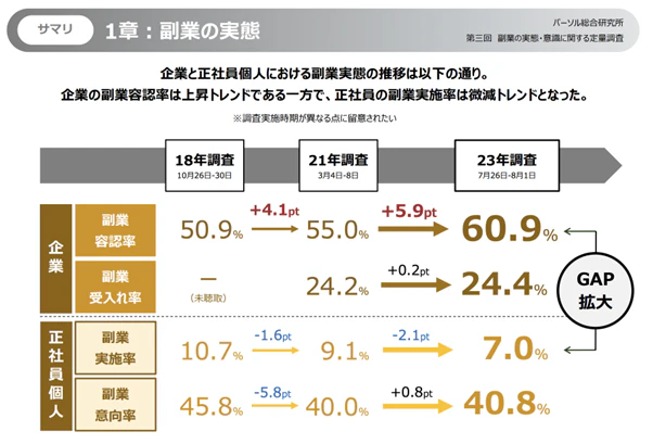 パーソル総合研究所のデータでは、2018年の調査から2023年の調査では10pt副業容認率が高まっていることがわかります。この背景には、企業が多様なはたらき方を容認することで、労働者のエンゲージメント向上や、優秀な人材の確保・定着に繋がるといった点が挙げられています。