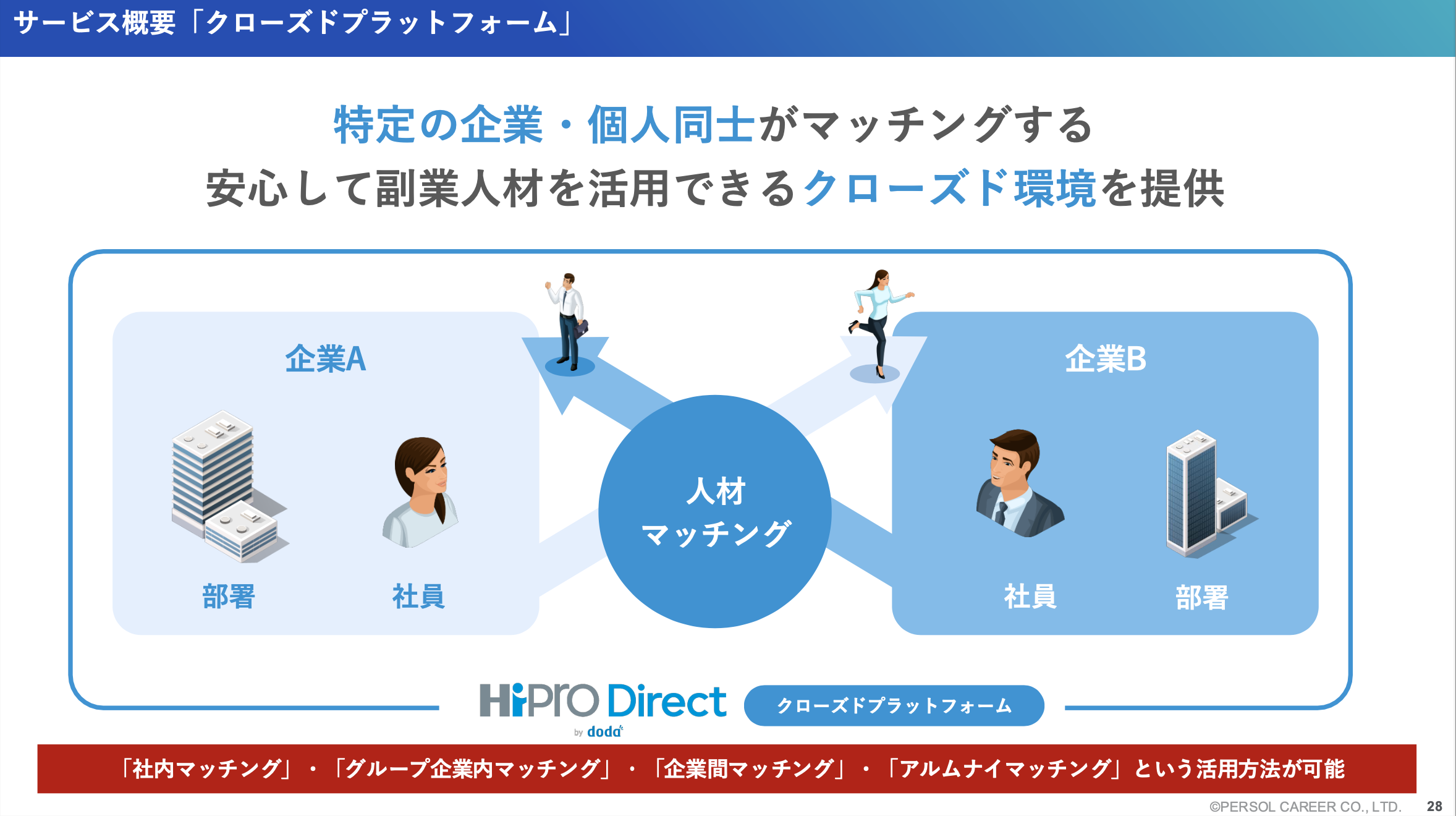 社内マッチング・グループ企業内マッチング・企業間の相互副業といった新たな働き方を希望する企業や個人を”クローズドな環境”の中でマッチングします。