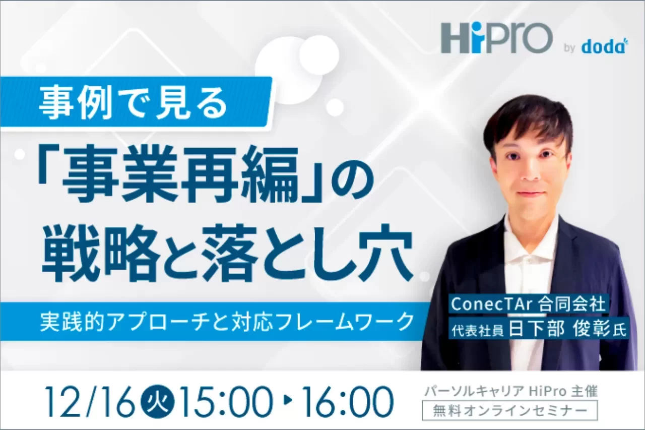 そこで今回、通算18年以上、60件以上におよぶM&A、PMI、海外事業にかかわる実務に携わってきたご経験をおもちのConecTAr合同会社の日下部 俊彰氏をお招きし、日下部氏が実際に携わってきた事例を交えながら「事業変革のリアル」についてお話いただきます。