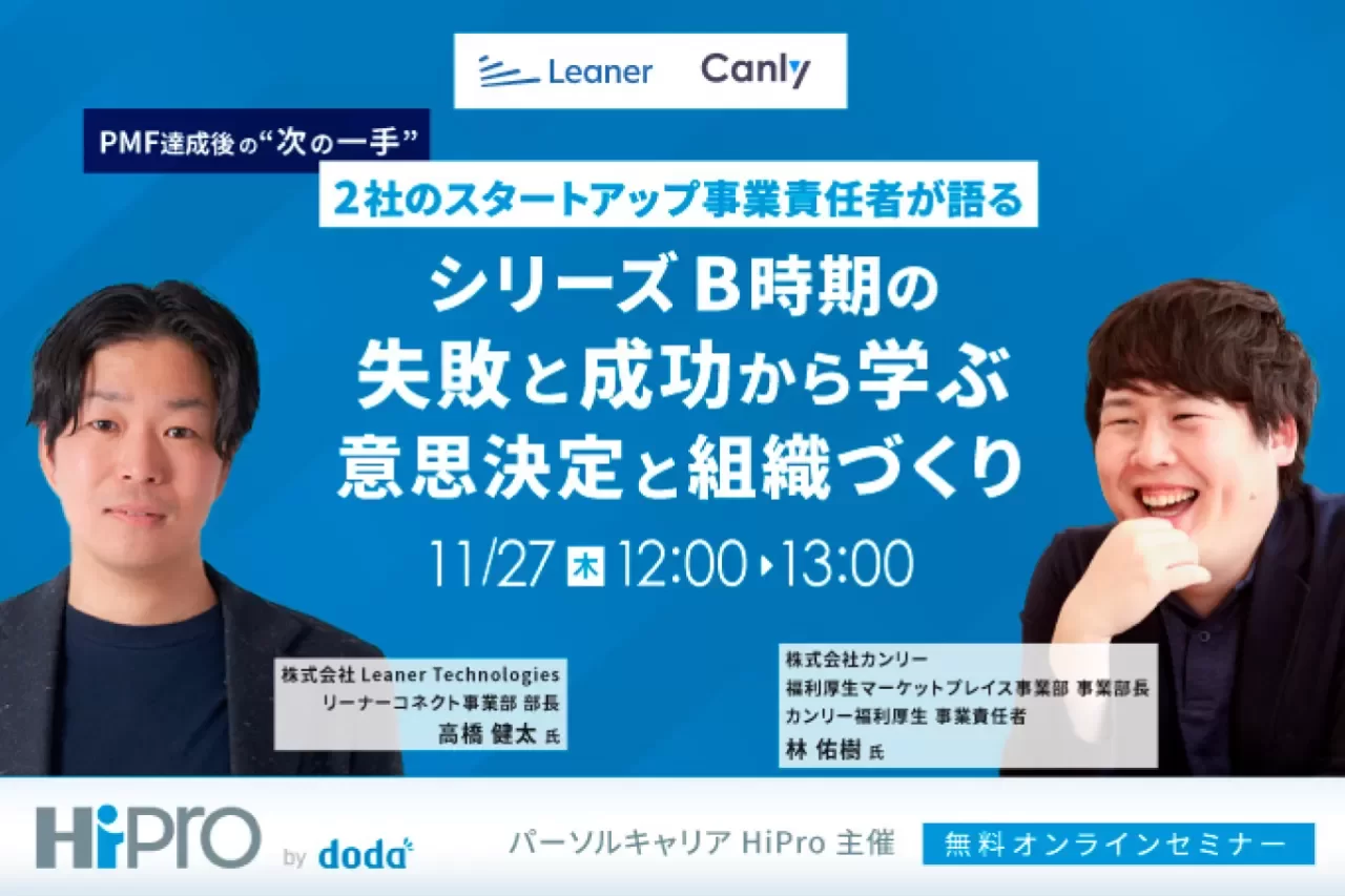 ご登壇いただくのは、調達・購買部⾨向けのクラウドサービス「リーナー」を開発・提供する株式会社Leaner Technologiesで、新規事業を起案・事業化を実現し同事業の責任者と新規事業開発を管掌する高橋 健太氏と、 店舗事業者向けの集客支援サービス「カンリー店舗集客」や売上につながる福利厚生サービス「カンリー福利厚生」を提供する株式会社カンリーにて、セカンドプロダクトの事業責任者として事業計画の策定から戦略実行まで幅広く従事している林 佑樹氏のお二方となります。