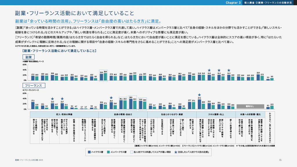 HiProの調査データによると、ハイクラス層(※1)のフリーランスのうち「はたらき方、就業環境」に満足している割合は80.5%にのぼりました。メンバークラス層(※2)でも68.7%が高い満足度を示しており、職種やレベルを問わず、多くの人が柔軟な環境に価値を感じていることがわかります。
