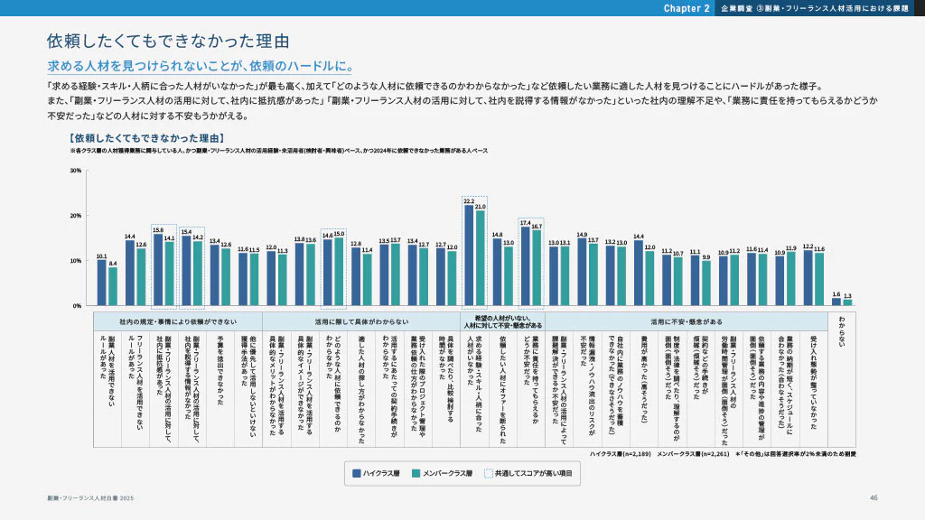 HiProの「副業・フリーランス人材白書2025」によれば、企業が副業・フリーランス人材へ依頼したくてもできなかった理由として「活用によって課題解決ができるか不安だった」ことが挙げられています。ハイクラス層(※1)に対しては13.0%、メンバークラス層(※2)に対しては13.1%が「課題解決ができるか不安」と感じているようです。