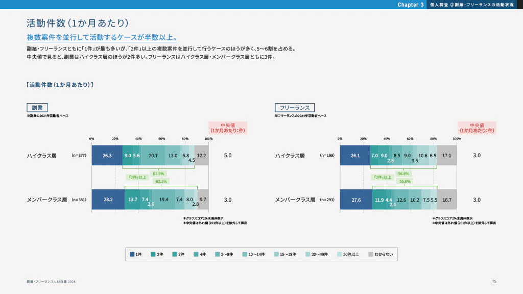 「副業・フリーランス人材白書2025」によると、副業を行うハイクラス層(※1)の1か月あたりの活動件数は、中央値で「5件」という結果になりました。内訳を見ると、61.5%もの人が「2件以上」の案件で活動していると回答しています。