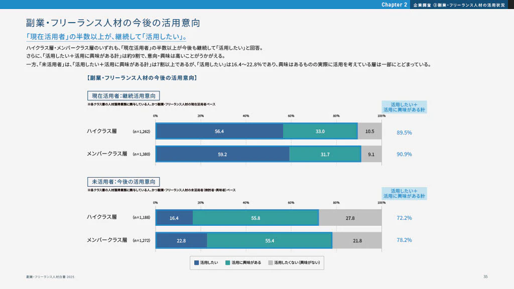 「副業・フリーランス人材白書2025」によると、現在副業人材を活用している企業の50%以上が「今後も活用したい」と回答しました。「活用に興味がある」企業まで含めると、その割合は約90%(ハイクラス層89.5%・メンバークラス層90.9%)に達します。