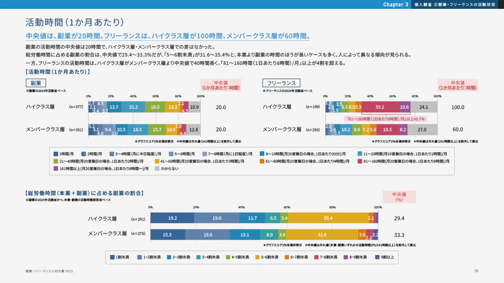 次に活動時間です。ハイクラス層・メンバークラス層(※2)ともに、1か月あたりの活動時間の中央値は「20時間」でした。