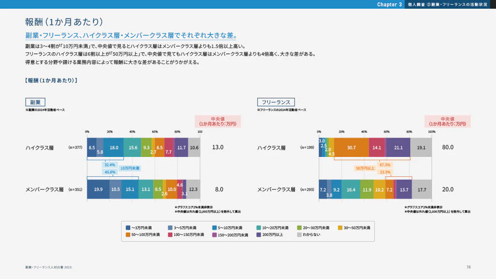 気になる報酬額ですが、ここには明確な「スキル差」が現れています。「副業・フリーランス人材白書2025」によると、ハイクラス層の中央値は1か月あたり13万円、メンバークラス層の中央値8万円です。