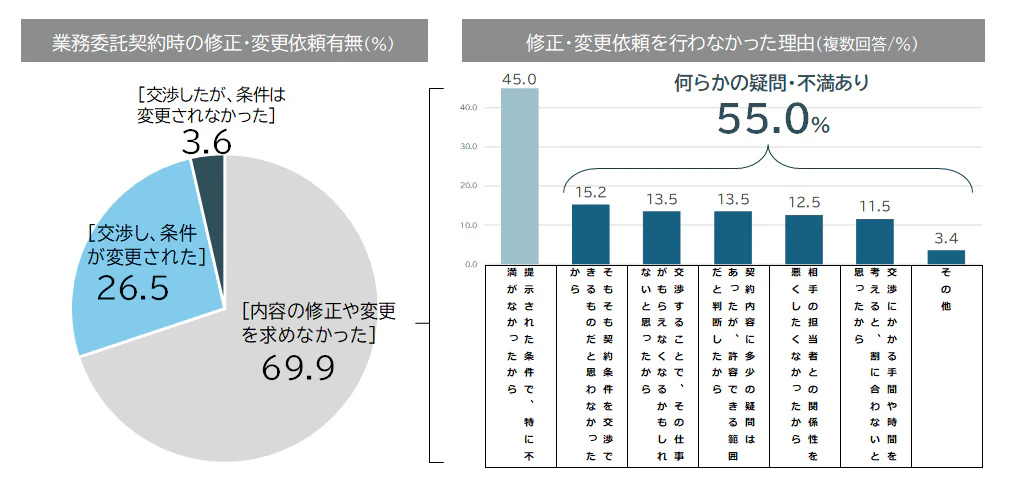これらは、契約書や発注書で「業務範囲」を明確にしていないことが原因です。パーソル総合研究所の調査によると、契約締結時に条件交渉(修正・変更依頼)を行わなかった割合は69.9%となっています。