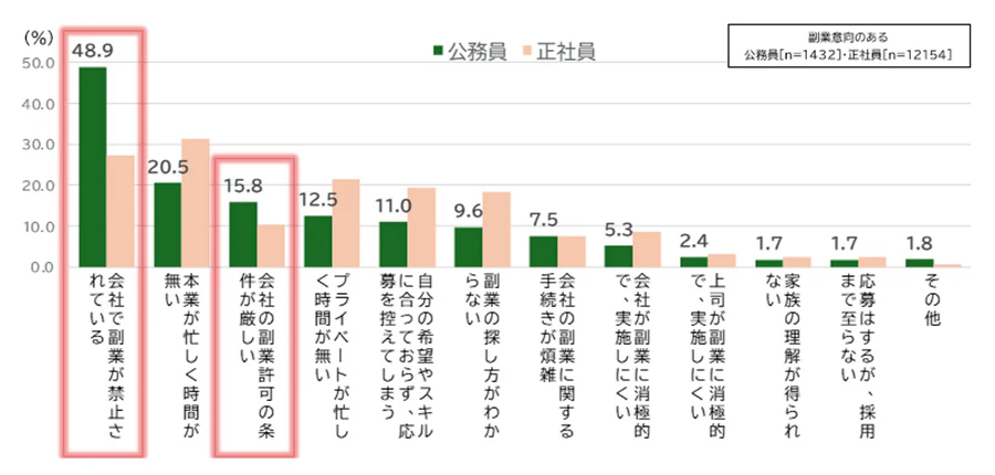 パーソル総合研究所の2025年調査では、公務員の48.9%が「組織で副業が禁止されている」と回答しました。正社員の27.4%と比べても高く、民間より厳しい運用実態がうかがえます。