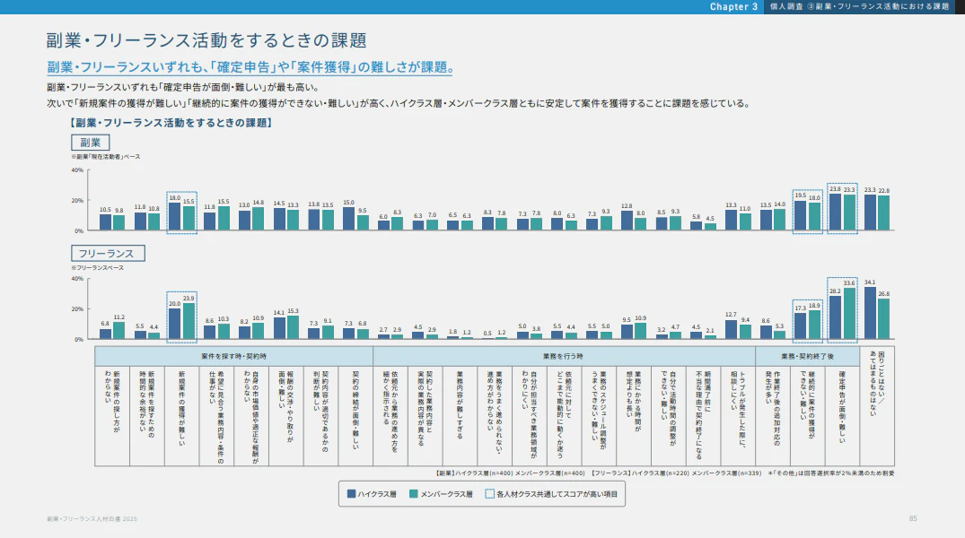 HiProが実施した「副業・フリーランス人材白書2025」によると、ハイクラス層の約15%が「報酬の交渉・やり取りが面倒・難しい」と回答しています。