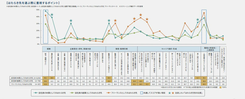 HiProの同調査によれば、フリーランスが仕事を選ぶ際に重視する点として「給与・報酬がよい」「自分の興味・やりたいことにマッチしている」がそれぞれ約40%となっており、フリーランスの多くが報酬と仕事内容の満足度を重視していることがわかります。