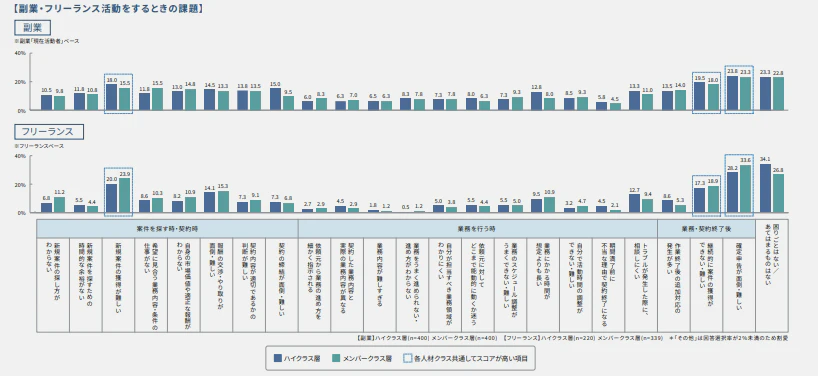 HiProの「副業・フリーランス人材白書2025」では、フリーランスが抱える課題として「確定申告が面倒・難しい」と回答した人が最も多く、ハイクラス層で28.2%、メンバークラス層では33.6%にものぼりました。