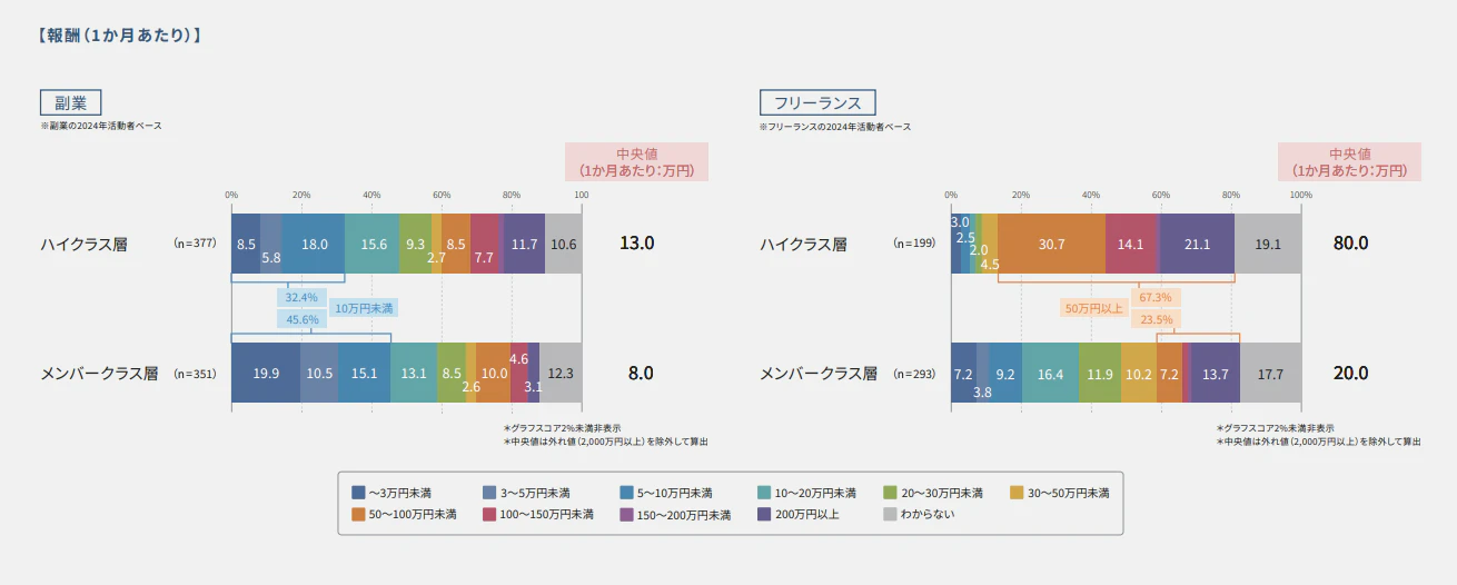 HiProが発表した「副業・フリーランス人材白書2025」によると、1か月あたりの副業報酬の中央値は、メンバークラス層で8万円、マネジメントや専門職などのハイクラス層では13万円に達しています。