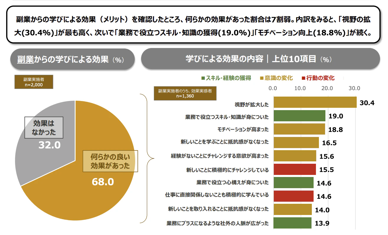 パーソル総合研究所の調査によると、副業経験者は「本業の仕事の視野が広がった」「新しいスキル・知識がついた」といったポジティブな影響を実感しています。
