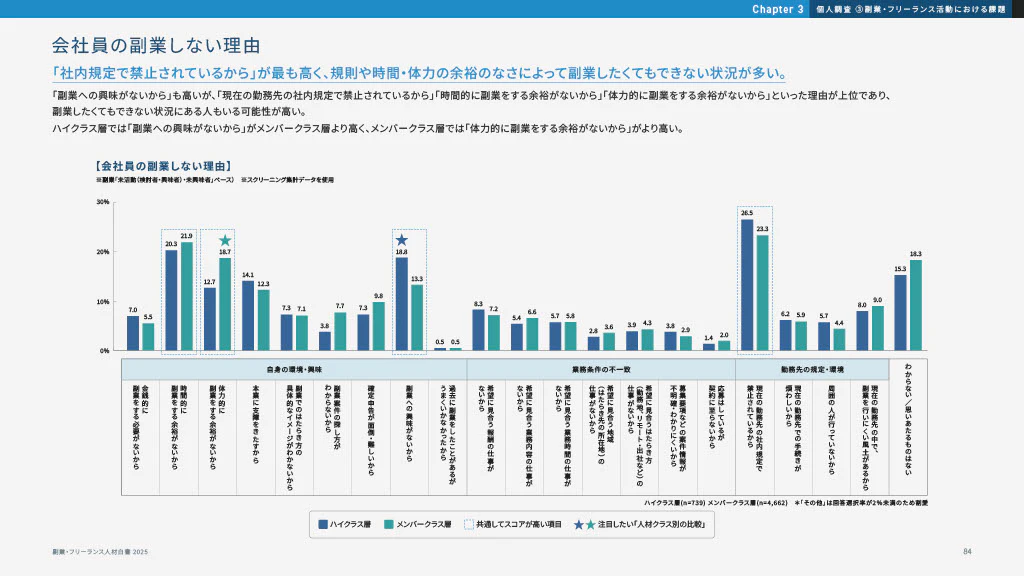 パーソル総合研究所の調査では、副業を実施していない理由として「時間的に副業をする余裕がないから」(ハイクラス層で20.3%)、「体力的に余裕がないから」(同12.7%)が上位に挙げられています。