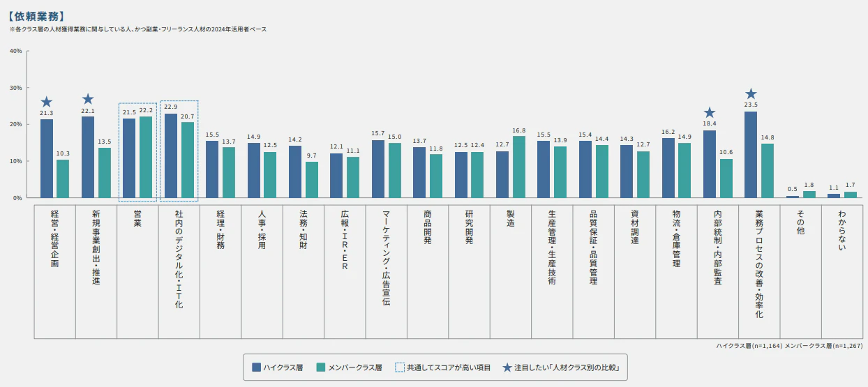 「副業・フリーランス人材白書2025」によれば、副業・フリーランス人材を活用した企業において、「マーケティング・広告宣伝」の業務を依頼した企業は約15ポイントという結果でした。特にメンバークラス層(※)からの依頼においては、「営業」「社内のデジタル化・IT化」「製造」に次いで、4番目に多くなっています。