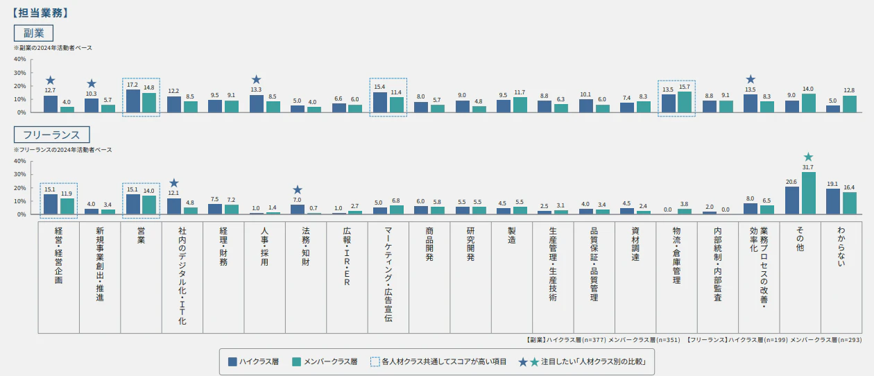 HiProの調査によると、副業を実施している人のうち「経理・財務」の業務を担当した人は、ハイクラス層(※1)で9.5ポイント、メンバークラス層(※2)で9.1ポイントです。専門業務経理・財務も、副業として行える事実が伺えるでしょう。