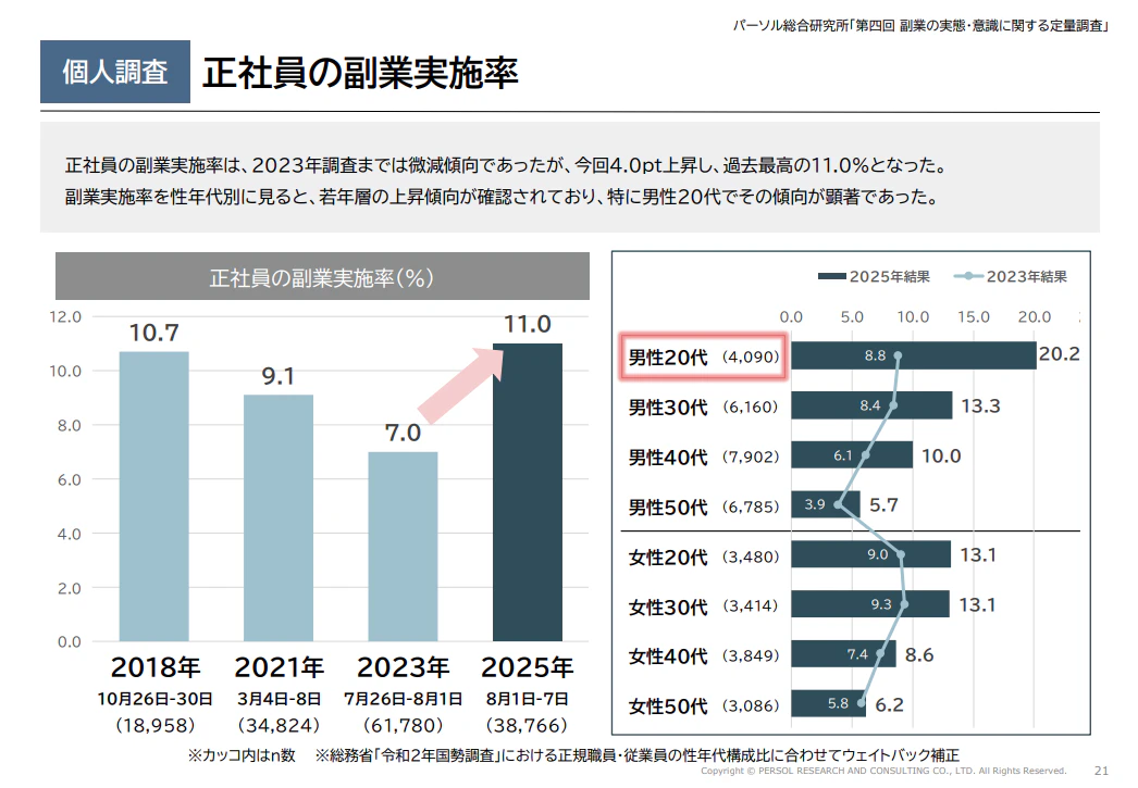 パーソル総合研究所の調査によると、正社員の副業実施率は11.0%と1割強にとどまっています。一方で、副業容認率や副業受入率は3割前後まで広がっており、副業を取り巻く制度や市場環境は着実に整いつつあることがうかがえます。
