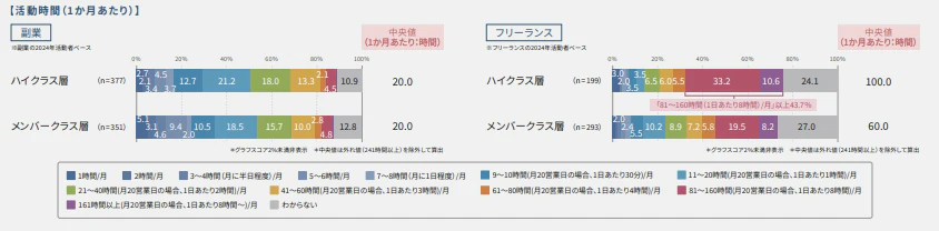 HiProの調査によれば、フリーランスの1か月の活動時間の中央値は、ハイクラス層(※1)で100時間でした。一方、メンバークラス層(※2)では60時間となっています。