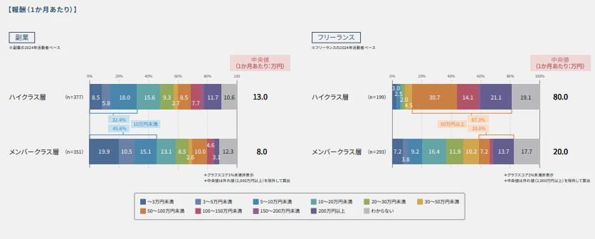 同調査によると、フリーランスの1か月の報酬の中央値は、ハイクラス層で80万円、メンバークラス層で20万円と大きな差があります。ハイクラス層に絞ると、全体の67.3%が月50万円以上の報酬を得ています。