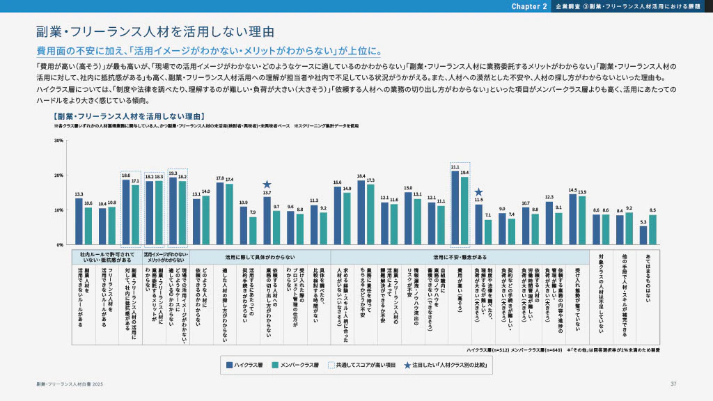 ハイクラス層(※1)に対しては18.4%、メンバークラス層(※2)に対しては17.3%と、スキルレベルに関係なく、企業がフリーランスに対して抱く共通の不安といえるでしょう。