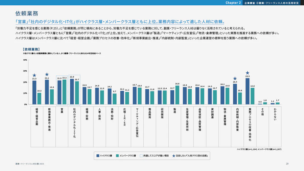 HiProが実施した「フリーランス・副業人材の活用実態調査(2025年)」によると、企業が外部人材に依頼した業務内容は以下のとおりです。